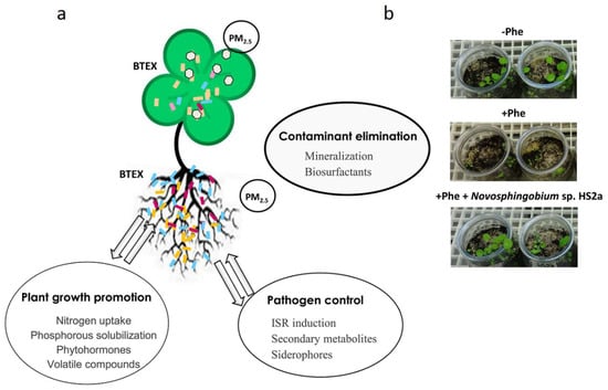 Schematic representation of bacterial activities in the rhizosphere and phyllosphere (a). ISR (induced systemic resistance); BTEX (benzene, toluene, ethylbenzene and xylenes); PM2.5 (fine particulate matter). The bioaugmentation of soil with Novosphingobium sp. HS2a, a bacterium able to mineralize phenanthrene (Phe), promotes clover growth on phenanthrene-contaminated soils (b) [].
