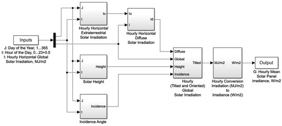 In this study, the value of the hourly global solar irradiation on an inclined plane, according to the scheme proposed in Figure 1, was calculated with six functional blocks: