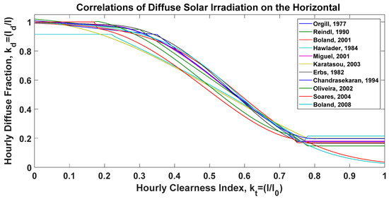 The most widely available solar energy data are the measurements of global solar irradiation on a horizontal surface and thus these are the main models used to estimate diffuse solar irradiation on the horizontal surface, utilizing the horizontal global solar irradiation. After the first studies, numerous models emerged utilizing a method that provided a relationship for solar irradiation (diffuse vs. global) on a horizontal surface. These models are generally expressed in terms of polynomials from the first to fourth degrees, relating the diffuse fraction to the clearness index. Validity is discussed in these studies in order to apply the findings at different locations from where the data have been used for their development and for different climatic conditions or other geographical latitudes. The original correlations were developed for daily values, but in this study the hourly diffuse fraction vs. hourly clearness index was used, as it is the hourly solar irradiation incident on the surface of the solar panel that is a fundamental input required in the simulation of a more comprehensive design of a photovoltaic system.