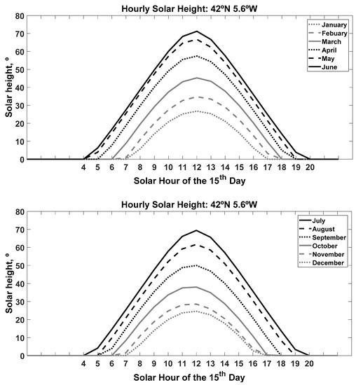 Extraterrestrial solar irradiation for various latitudes can be estimated from the following parameters: the solar constant, the solar declination, and the time of year. For hourly or shorter periods, the solar angle at the beginning and the end of the period has to be considered (see the work of Allen [40], recommended by the FAO for the development of calculations for crop evapotranspiration, Duffie et al. [41], and Kalogirou [42]). This is done with Equation (13).