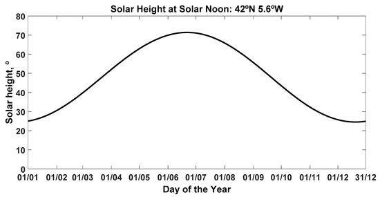 - Duffie, J.A.; Beckman, W.A.; Blair, N. Solar Engineering of Thermal Processes, Photovoltaics and Wind, 5th ed.; John Wiley & Sons: Hoboken, NJ, USA, 2020; pp. 37–41. [Google Scholar]
