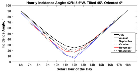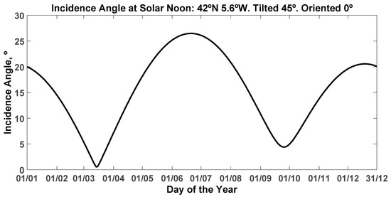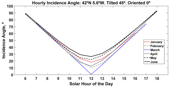 The study of the variation of the angle of incidence is very important since it provides the time of year in which the use of solar energy is maximum, according to the inclination and orientation of the solar panel. The results of this model, if compared with the profile of annual energy needs of a photovoltaic system for a particular greenhouse, offer the possibility of finding the relationship (inclination–orientation) for each time of the year in which solar capture is optimal.