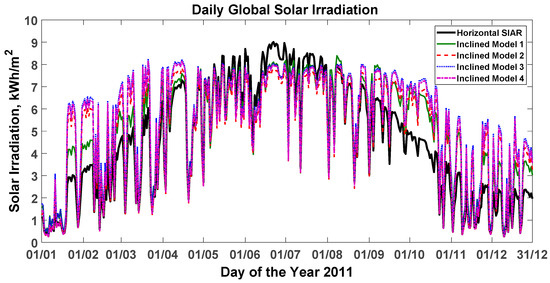 The solar panel global solar irradiation for 2011 was 1.84 MWh/m2 with the CENSOLAR model, which used coefficients; 1.84 MWh/m2 for the Liu and Jordan model; 1.99 MWh/m2 for the Temps and Coulson model; 1.93 MWh/m2 for the Klucher model; and 1.86 MWh/m2 for the Hay model.