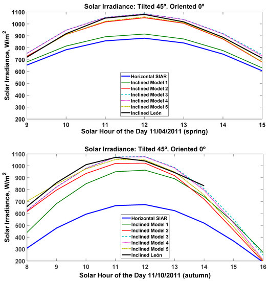 The result of the comparison of the recorded measurements of solar irradiance on the horizontal surface (i.e., the SIAR data) and the inclined plane of the solar panel (i.e., the pyranometer in León) with the results obtained with Inclined Models 1, 2, 3, 4, and 5 (Figure 10) show a better approximation with the anisotropic models for four random sunny days. Specifically: Inclined Model 5, which used the Hay corrections, obtained better results on 4 November 2011 and 30 June 2011 with regard to the RMSE (17.83 and 11.95 W/m2) and R2 (0.9835 and 0.9817), respectively. Inclined Model 4, which used the Klucher corrections, performed best on 6 January 2011, with RMSE = 31.54 W/m2 and R2 = 0.9100. Inclined Model 3, which used Temps and Coulson corrections, obtained better results on 10 November 2011, with RMSE = 31.44 W/m2 and R2 = 0.9454.