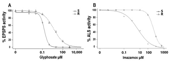 The I50 (glyphosate concentration to reduce the enzyme activity by 50%) in the S population was 0.22 µM, while for the R population was 4.36 µM. These results showed the activity of the enzyme in the R population was approximately 20 times higher compared to the S population (Figure 3A).
