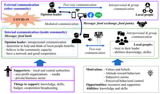 In aspects of communication, in each case, opinion leaders shared similar qualifications of having a determination to help and think of the benefits for local people, and a belief in the community’s capacity. Moreover, having a network and good cooperation were important in the case of food exchange between two communities. The intrapersonal communication of opinion leaders and local people were a crucial initial stage, leading to their understanding of other difficulties and food security behaviors. The main messages of self-reliance by planting vegetables or storing food and procedural knowledge such as processes of the food bank, the food exchange, and the food pantry were communicated among the leaders and community members. Channels of communication were highlighted such as personal media, local broadcasting tower, social media, and mobile phone. Two-way and networking communication were also meaningful to promote sustainable food security during the crisis.
