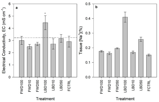 | Electrical Conductivity (EC, mS cm−1) † | 8.34 ± 1.26 | 10.99 ± 0.030 | ** |