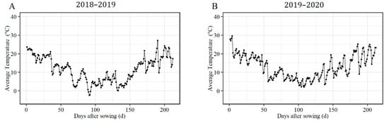 The daily average temperature of rapeseed after sowing in 2018–2019 (A) and 2019–2020 (B).