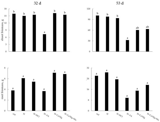 Soybean root and shoot biomass at 32 (growth stage V8+) and 53 d (growth stage R1–R2) after planting for a hydroponic nutrition study. “ctrl” = Hoagland solution; “H” = Hopkins single-nutrient source (SNS) solution; “HCl” and “AA” indicate that pH was adjusted in-season with hydrochloric or acetic acid, respectively; “-Ca/Mg” = reductions of 21% for Ca and 73% for Mg, as compared to the full strength H solution; “+Mn” = 25% increase in concentration compared to full-strength H solution, also adjusted with AA (Table 1). Treatments within a single graph (quadrant) sharing the same letter are not statistically different (p = 0.05; n = 3).