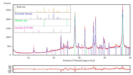 The by-product was immediately cooled from 1600 °C to room temperature under pressure using several water jets. The solidified MgSiO3-rich by-product did not exhibit a granulometric uniformity and thus underwent a forming process. First, the by-product was dried in a rotary dryer at a beneficiation plant [12]. After drying, the particle size distribution (100 mesh size, ~149 μm) was obtained by sieving, and the mineralogical phases of the by-product were determined by X-ray diffraction (XRD) in a Philips X-ray diffractometer (Table 1). The crystalline phases were identified by comparing the sample using the PDF2 Database of the International Center for Diffraction Data and the Inorganic Crystal Structure Database (ICSD; Figure 1). The values were calculated following the method of Rietveld [23], using the standard ICSD crystalline structures and internal fluorite (CaF2) to determine the amorphous phase.
