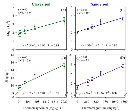 Figure 2. Leaf concentrations of (A,C) Mg and (B,D) Si in maize grown in clayey soil and sandy soil as a function of Thermomagnesium dose.