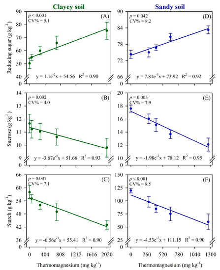 Figure 3. Leaf concentrations of (A,D) reducing sugars, (B,E) sucrose, and (C,F) starch in maize grown in clayey soil and sandy soil as a function of the Thermomagnesium dose.
