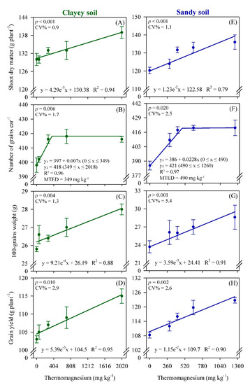 Figure 4. (A,E) Shoot dry matter, (B,F) number of grains per ear, (C,G) 100-grains weight, and (D,H) grain yield per plant of maize grown in clayey soil and sandy soil as a function of the Thermomagnesium dose.