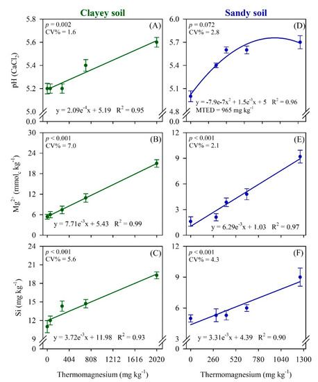 Figure 5. (A,D) Soil pH, (B,E) exchangeable Mg2+, and (C,F) Si availability in clayey and sandy soils as a function of the Thermomagnesium dose.
