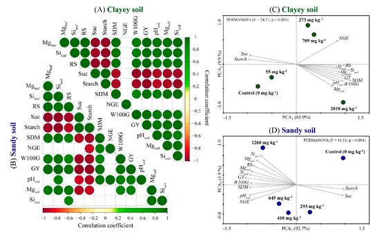 Pearson’s correlation analysis revealed different patterns of significant correlations (p ≤ 0.05) of the parameters between clayey and sandy soils (Figure 6). For maize established in clayey soil, significant correlations were observed among all parameters, except the number of grains per ear (Figure 6A). Only sucrose and starch were negatively correlated with the other parameters, but were positively correlated with each other. However, in sandy soil, soil available Si correlated significantly only with reducing sugar and available Mg2+ (Figure 6B), and Mg2+ did not correlate with shoot dry matter and W100G. Interestingly, in both soils, the grain yield was significantly correlated with W100G, but not the number of grains per ear.