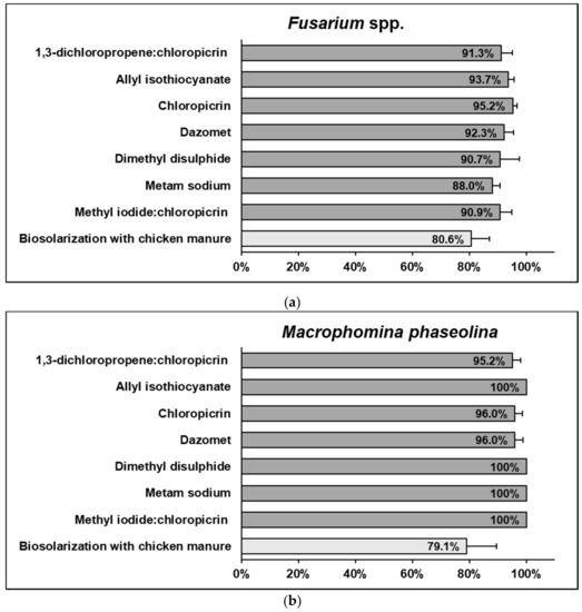 Average relative efficiencies in reducing SFP soil inocula of several soil disinfestation treatments in strawberry fields: Fusarium spp. (a) and Macrophomina phaseolina (b). Data are the mean of 12 to 57 replicates depending on the treatment and obtained during 11 growing seasons. Error bars represent the standard error of the mean. Bars filled with the same shade of grey do not differ significantly according to the Bonferroni test (p < 0.05).