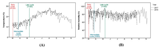 Climatic conditions recorded in the experimental trials: (A) temperature, (B) relative humidity. Sowing dates for early (in red), intermediate (in blue), and late cycles (in green) are presented inside parentheses. The lengths of the registers for 2017 (continuous line) and 2018 (dashed line) are different because the late cycle was studied only in 2017.