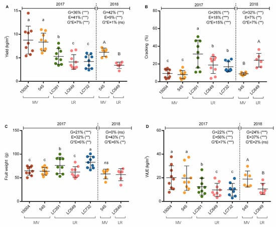 Differences between modern varieties (545, 15004) and landraces (LC391, LC649, LC732) in agronomic traits. (A) Yield, (B) cracking incidence, (C) fruit weight, (D) water-use efficiency (WUE). Mean ± SEM calculated from 2017 (Exp7–Exp16) and 2018 trials (Exp1-Exp6). Within graphs, and for each year, different letters (2017, lowercase; 2018, capital letters) indicate significant differences between genotypes (Student–Newman–Keuls, p < 0.05). G, E, and G*E percentages indicate the relative contributions of genotype, environment, and genotype-by-environment interaction, respectively, to the total observed phenotypic variation. Level of significance: ** p < 0.01; *** p < 0.001; ns, not significant (p > 0.05).