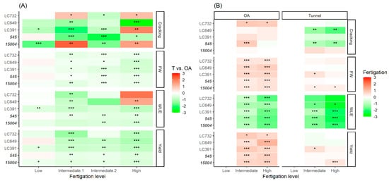 Environmental effects on yield related traits in Penjar tomato landraces (LC732, LC649, LC391) and modern varieties (545, 15004, marked in bold). (A) Effect of cultivation under tunnel (T) in comparison with cultivation in open air (OA) conditions, across increasing fertigation regimes. Color scale in heatmap represent the log2-transformed ratio of trait value in T respect to OA. Intermediate.1 and Intermediate.2 refers to two comparisons in the intermediate (75% ETc) range of fertigation. (B) Effect of intermediate (75% ETc) and high (120% ETc) fertigation in comparison with low fertigation regimes (25% ETc) under OA and T environments. Color scale in heatmap represent the log2-transformed ratio of trait value at each fertigation respect low fertigation regimes. FW: fruit weight; WUE: water-use efficiency. Level of significance: * p < 0.05; ** p < 0.01; *** p < 0.001; empty when not significant (p > 0.05).