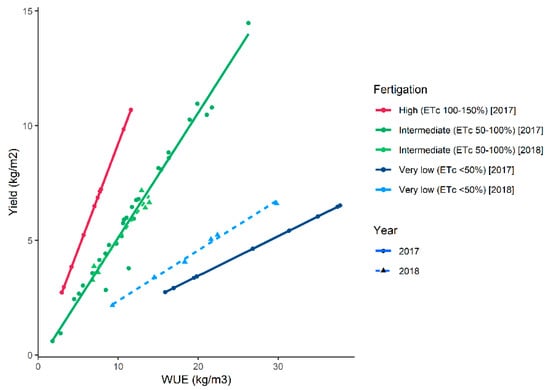 WUE and yield are interrelated traits, although mathematically they can be considered independent variables. Ideally, both traits should be optimized to achieve the highest yields with the highest WUE. Plotting WUE against yield revealed clearly distinct patterns driven by fertigation doses (Figure 5). Optimal WUE is clearly linked to low fertigation management practices, where small increases in yield are accompanied by dramatic increases in WUE. Thus, in low-input conditions (ETc < 50%) plants do not show high yields, because there is a deficit in water or fertilizers, but WUE is maximized.