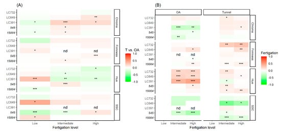 Environmental effects on quality traits in Penjar tomato landraces (LC732, LC649, LC391) and modern varieties (545, 15004, marked in bold). (A) Effect of cultivation under tunnel (T) in comparison with cultivation in open air (OA) conditions, across increasing fertigation regimes. Color scale in heatmap represent the log2-transformed ratio of trait value in T respect to OA. (B) Effect of intermediate (75% ETc) and high (120% ETc) fertigation in comparison with low fertigation regimes (25% ETc) under OA and T environments. Color scale in heatmap represent the log2-transformed ratio of trait value at each fertigation respect low fertigation regimes. SSC: soluble solids content. Level of significance: * p < 0.05; ** p < 0.01; *** p < 0.001; empty when not significant (p > 0.05); nd = data not available.