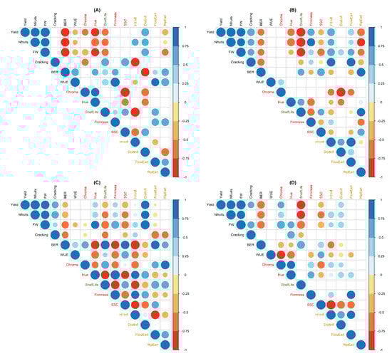 Correlation matrix for earliness, agronomic, fruit quality, and shelf-life traits in modern varieties (A) 545, (B) 15004, and landraces (C) LC649, (D) LC732, obtained in 2017 trials (n = 10). Colored boxes denote significant correlations (p < 0.05), while uncolored boxes indicate nonsignificant correlations. The size of the circles is proportional to the correlation coefficients. The sign and the magnitude of the correlation are indicated by the colors according to the scale in the right panel. FW: fruit weight; Nfruits: number of fruits per plant; DistInfl: distance between inflorescences; H1infl: height of the first truss; SSC: soluble solids content; BER: blossom-end-rot; WUE: water use efficiency; ShelfLife: shelf life at 90 days. Name of the variables are colored by groups (black = agronomic traits; red = quality traits; green = postharvest shelf life; yellow = plant architecture and earliness traits).