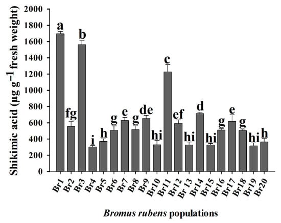 Overall, the B. rubens populations response was different, which resulted in multiple patrons of resistance to the herbicide glyphosate. This fast screening at 1000 µM of glyphosate, showed 17 resistant populations out of 20, which had accumulated the least shikimic acid (Figure 2). Br1, Br3, and Br11 populations accumulated the highest amount of shikimic acid at a rate of 1200 to 1700 µg g−1 fresh weight, whereas the other 17 populations accumulated 300 to 700 µg g−1 fresh weight.