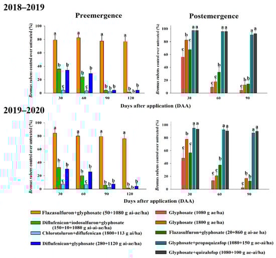 Field trials carried out in “La Reina” (Br10 (GR50 factor: 6.79 and LD50 factor: 7.41)) in almond trees, demonstrated the potential alternatives to glyphosate. Overall, the percentage B. rubens control was similar in the two seasons. Treatments applied pre-emergence were the least promising because only the glyphosate and flazasulfuron tank mix had the best results in both seasons (Figure 4). This treatment maintained an efficacy close to 80% (±) against B. rubens from 30 DAA to 120 DAA (Figure 4). Otherwise, the application with chlorotoluron and diflufenican had the worst result, with poor control (20%) from 30 to 120 DAA in both growing seasons. Diflufenican plus iodosulfuron and glyphosate had satisfactory control in nontarget species, such as Lolium sp., Vulpia sp., and Conyza sp. but not against B. rubens (Figure 4 and Figure 5). Herbicides applied in postemergence were a more promising chemical alternative. Grass weed herbicides (ACCase inhibitors), such as propaquizafop and quizalofop in tank mix with glyphosate, controlled B. rubens up to 90% from 30 to 90 DAA (Figure 5). Additionally, this tank mix controlled other important weeds, such as Lolium sp., Hordeum murinum, and Bromus sp. Glyphosate resistance was visualized with applications at 1080 g (control under 60%) and 1800 g ae ha−1 (control close to 80% but only at 30 DAA). Flazasulfuron (20 g ai ha−1) plus glyphosate (860 g ae ha−1) is a commercial product (Chikara Duo®) that showed to be a good treatment, but only for the first 30 DAA, after which time B. rubens control was poor (Figure 4).