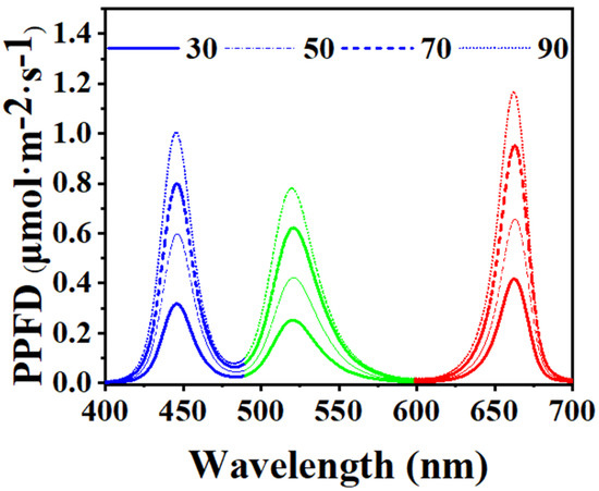 After sowing, the seeds were placed in the dark for 4 days, then cultivated underneath the LED tubes for 4 days (12 h / 12 h, light / dark). Four different total light intensities (photosynthetic photon flux density, PPFD) were set: 30, 50, 70, 90 μmol·m−2·s−1. Light spectra were measured by a spectral analyzer (Lighting Passport ALP-01, AsenseTek, Taiwan), and the light spectra of each treatment is shown in Figure 2. At 4 days after light treatment, samples were collected for the growth parameters determination, frozen rapidly with liquid nitrogen, and stored at −40 °C for the phytochemical determination.