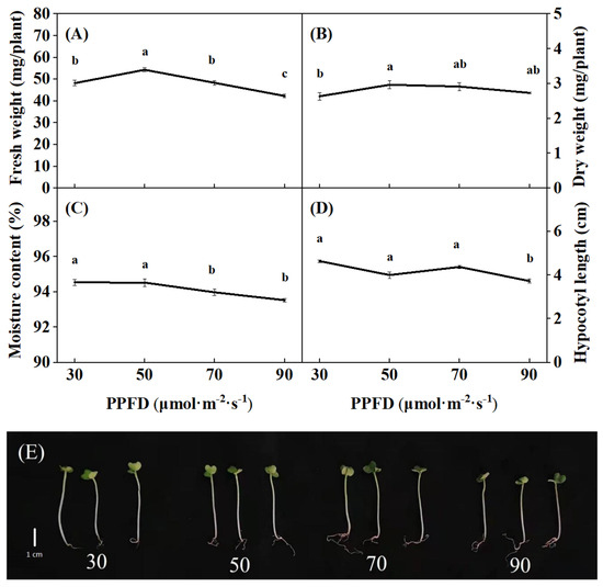Fresh weight (A), dry weight (B), moisture content (C), and hypocotyl length (D) of broccoli microgreens response to different light intensity treatments. The lowercase letters in all figures represent the significant difference (p < 0.05). Vertical bars indicate the means ± SE (n = 15). Photo of broccoli microgreens (E) was taken at 8 days after sowing, where the bar represents 1 cm.