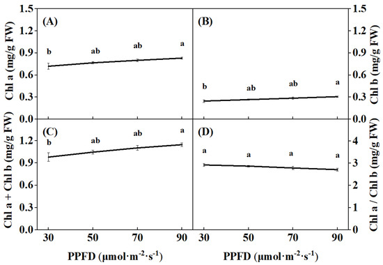 Effects of different light intensity on the contents of Chl a (A), Chl b (B), Chl a + Chl b (C), and Chl a / Chl b (D) in broccoli microgreens. The lowercase letters in all figures represent the significant difference (p < 0.05). Vertical bars indicate the means ± SE (n = 3).