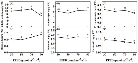 Effects of different light intensity on the contents of soluble protein (A), soluble sugar (B), free amino acid (C), flavonoid (D), vitamin C (E), and carotenoid (F) in broccoli microgreens. The lowercase letters in all figures represent the significant difference (p < 0.05). Vertical bars indicate the means ± SE (n = 3).