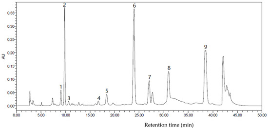 HPLC chromatogram of glucosinolates. 1: progoitrin (PRO); 2: glucoraphanin (GRA); 3: sinigrin (SIN); 4: 4-hydroxy-glucobrassicin (4-HGBS); 5: glucobrassicanapin (GBN); 6: glucoerucin (GER); 7: glucobrassicin (GBS); 8: 4-methoxy-glucobrassicin (4-MGBS); 9: neoglucobrassicin (NGBS).