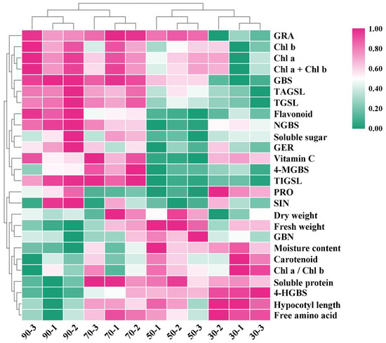 A heatmap integrating the response of the measured parameters showed a comprehensive view of the effects of light intensity on the growth and the contents of phytochemicals in broccoli microgreens (Figure 7). In terms of measured parameters responses, the 30 and the 50 μmol·m−2·s−1 clusters are the closest to each other, while the 70 and the 90 μmol·m−2·s−1 clusters are the closest to each other. Lower light intensities (30 and 50 μmol·m−2·s−1) and higher ones (70 and 90 μmol·m−2·s−1) showed opposite responses in most of the measured parameters. The 30 and the 50 μmol·m−2·s−1 clusters both showed higher fresh and dry weight, moisture content as well as hypocotyl length than the 70 and the 90 μmol·m−2·s−1 clusters. Meanwhile, the 70 and the 90 μmol·m−2·s−1 clusters showed a similar response of most of the phytochemical parameters, such as the contents of flavonoid, TGSL, 4-MGBS, TIGSL, and so on. Clusters 70 and 90 μmol·m−2·s−1 led to higher contents of Chls, soluble sugar, flavonoid, vitamin C, GER, GBS, 4-MGBS, and NGBS in broccoli microgreens. Besides, cluster 70 μmol·m−2·s−1 elicited more phytochemicals than the other three clusters. Compared to those under 90 μmol·m−2·s−1, under the irradiation of 70 μmol·m−2·s−1, the content of PRO was lower, and the contents of soluble protein, free amino acid, 4-HGBS as well as hypocotyl length were higher.