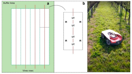 (a) Sketch map of the autonomously mowed (AM) area; (b) Detail of a single plot and measurements positions: IR (interrows) and UT (under-trellis); (c) Image of the autonomous mower operating during October 2019.