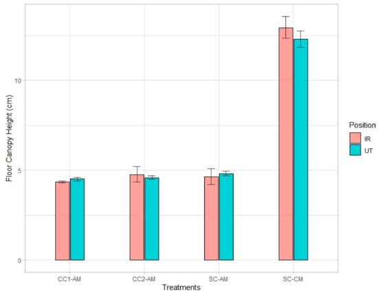 Effect of treatments (CC1-AM, CC2-AM, SC-AM, SC-CM) and positions (IR and UT) on floor canopy height. Error bar represents the upper and lower limits of the 95% confidence interval.