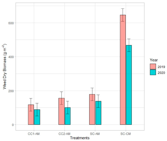 Effect of treatments (CC1-AM, CC2-AM, SC-AM, SC-CM) and years on weed dry biomass. Error bar represents the upper and lower limits of the 95% confidence interval.