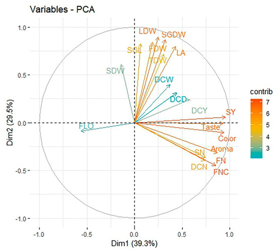 Correlation biplot of the two first principal component variables in the two-dimensional space. FLO = Day to Flower; SGL = Stigma Length; SGDW = Stigma Dry Weight; SDW = Stamen Dry Weight; TDW = Tepal Dry Weight; FDW = Flower Dry Weight; FNC = Flower Number per Corm; FN = Flower Number; SY = Stigma Yield; DCN = Daughter Corm Number; DCW = Daughter Corm Weight; DCD = Daughter Corm Diameter; DCY = Daughter Corm Yield; LDW = Leaf Dry Weight; LA = Leaf Area; SN = Shoot Number.