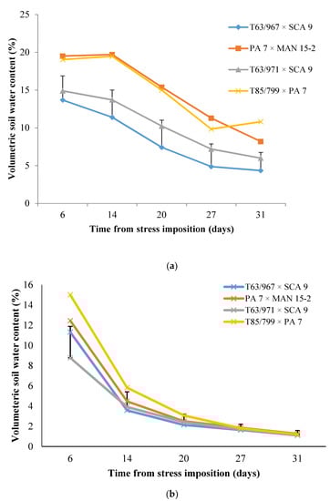 Changes in volumetric soil water contents under four cocoa varieties in (a) well-watered and (b) water-stressed treatments in a gauzehouse facility. In well-watered treatments, measurements were done prior to watering plants to field capacity. Bars represent the LSD value for comparing varieties at each sampling date