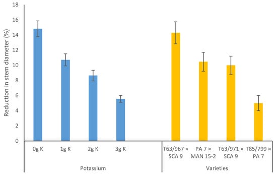 Reduction in stem diameter of cocoa seedlings under water-stress relative to well-watered conditions as affected by potassium application and varieties, 45 days from stress imposition. Bars represent standard error of the mean.