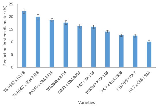 Reduction in stem diameter of cocoa varieties under water-stress relative to well-watered conditions 40 days from stress imposition. Bars represent standard error of the mean.
