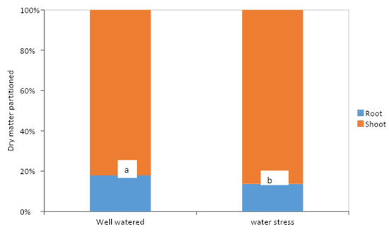 Relative dry matter partitioned into roots and shoots of cocoa seedlings after subjecting four month old cocoa seedlings to 55 days of water stress or well-watered conditions in a gauzehouse facility. Data from experiment 1; different letters (a and b) indicate significant differences at p = 0.05.
