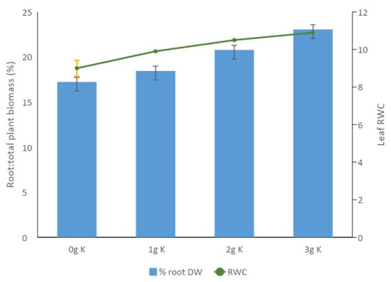 Effect of potassium on the proportion of dry matter partitioned to roots and leaf relative water content (RWC) of cocoa seedlings evaluated under water stress conditions in a gauzehouse facility. RWC was determined at 35 days after water stress, root dry weight at 55 days after stress. Values represent data from experiment 1.