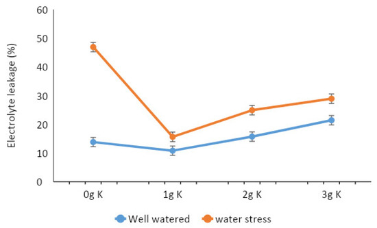 Effect of potassium on leaf electrolyte leakage of cocoa seedlings subjected to 35 days of water stress or well-watered conditions in a gauzehouse facility.