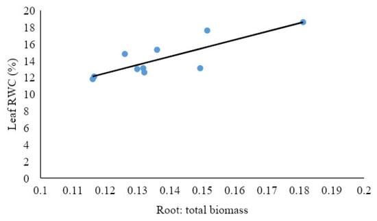 Relationship between leaf relative water content (RWC) and dry matter partitioned to roots of ten cocoa seedling varieties evaluated under 45 days of water stress in a gauzehouse facility.