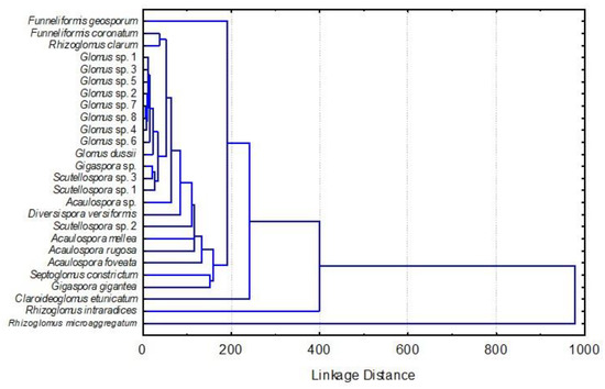The cluster analysis shows that Glomus sp. 1 and Scutellospora sp. 1 have characteristics that make them similar to each other, given the minimal distances between them (Figure 2). This type of analysis shows the similarity in AMF species composition [31]. These results agree with de Assis et al. [52], where there is a low diversity of phylum Glomeromycota in disturbed and eroded areas. More studies are needed to determine the effects of human activities, soil, and climate factors on AMF communities.