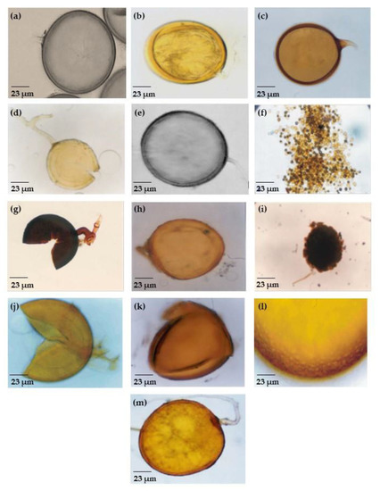 Morphology of some AMF species isolated from coffee roots. (a) C. etunicatum, (b) F. geosporum, (c) F. coronatum, (d) R. clarum, (e) R. intraradices, (f) R. microaggregatum, (g) S. constrictum, (h) D. versiformis, (i) Gl. dussii, (j) A. rugosa, (k) A. mellea, (l) A. foveata, and (m) G. gigantea.