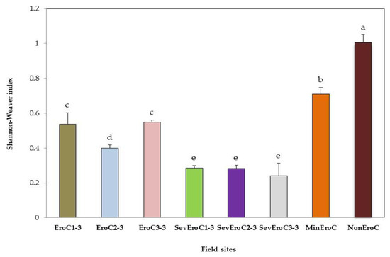 The highest Shannon–Weaver diversity index was observed at NonEroC and the lowest indexes were quantified at the sites with different erosion degrees (Figure 3). NonEroC, with overhead cover of dense herbaceous vegetation and without erosion, showed the highest AMF diversity.