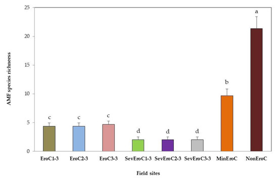 Species richness of AMFs in field sites with different erosion degrees. Each column color indicates a different field site with coffee. Columns with the same letter are not significantly different according to the post hoc LSD Fisher test at p < 0.05.