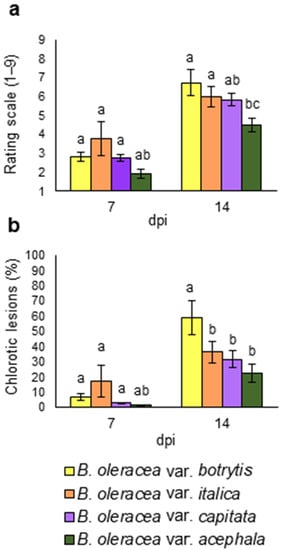 Resistance parameters from four different Brassica oleracea crops: B. oleracea var. botrytis, B. oleracea var. italica, B. oleracea var. capitata, and B. oleracea var. acephala, inoculated with Xanthomonas campestris pv. campestris under greenhouse conditions, at 7 and 14 days post inoculation (dpi). (a) Damage score and (b) lesion percentage. Data represent the averages of 3 repetitions. Different letters indicate significant differences at p < 0.05. Error bars indicate the standard errors.